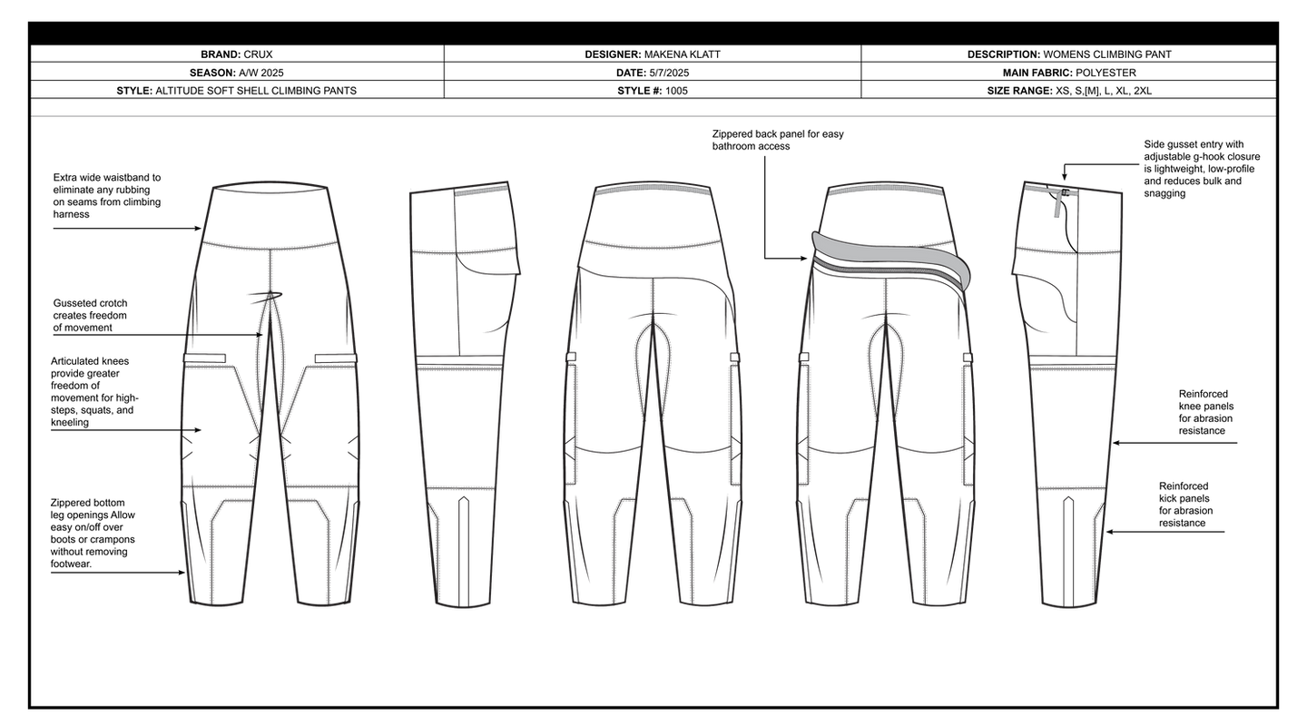 Introducing CRUX, a recent project where I developed an alpine climbing kit specifically designed for female athletes. This innovative kit aims to make it easier for women to go to the bathroom while alpine climbing without having to tamper with their safety harness, addressing a common challenge faced by female climbers. With a focus on practicality and functionality, CRUX is revolutionizing the climbing experience for women.